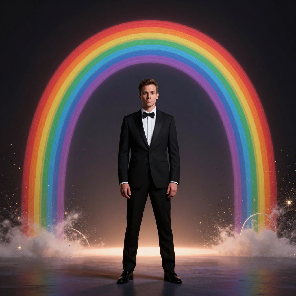 Photograph of a man in a black tuxedo with a bow tie, standing centered under a vibrant rainbow, surrounded by smoke and sparkles.