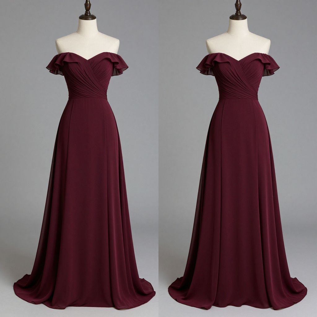 Elegant burgundy off-the-shoulder prom dresses showcase ruffled detailing and a fitted bodice, transitioning into flowing chiffon fabric that drapes gracefully to the floor, presented side-by-side on mannequins.