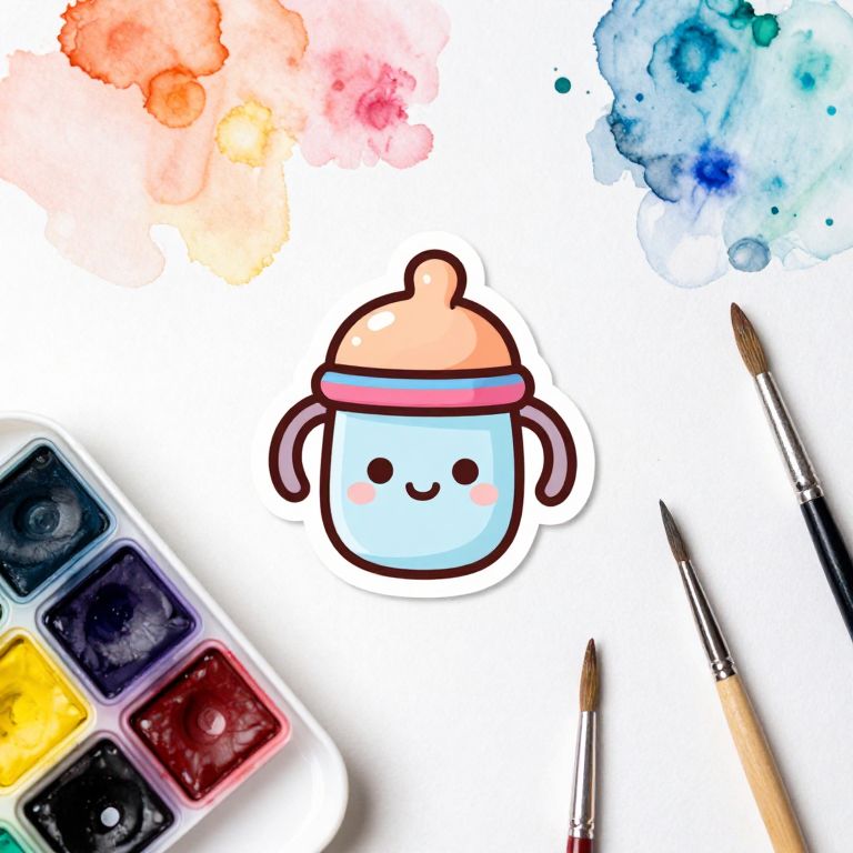 Heptagon logo sticker cute girly cartoon baby sippy cups with cute faces on the cups, paint brushes and artistic paint pallet are laying in the foreground, paint watercolour background,