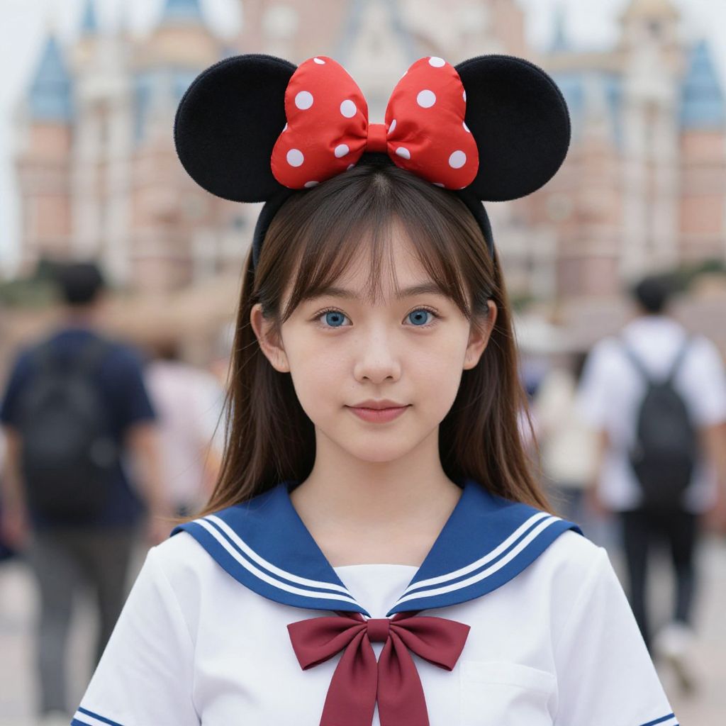 Boys disney costume, blurry background, blurry, bow, red bow, looking at viewer, sailor collar, realistic, 1girl, outdoors, mouse ears, animal ears, blue eyes, blue sailor collar, upper body, fake animal ears, school uniform, shirt, bowtie