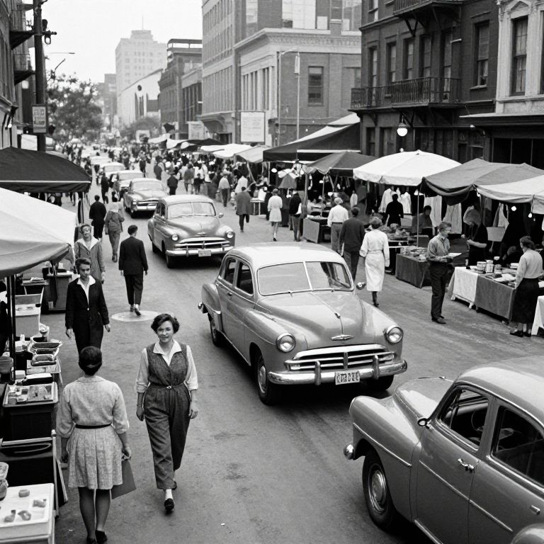 Documental style black-and-white photograph of urban life in the 1950s, crowded streets with classic cars, bustling market stalls, and pedestrians in retro clothing, strong contrasts and grainy texture emphasizing the historic moment.