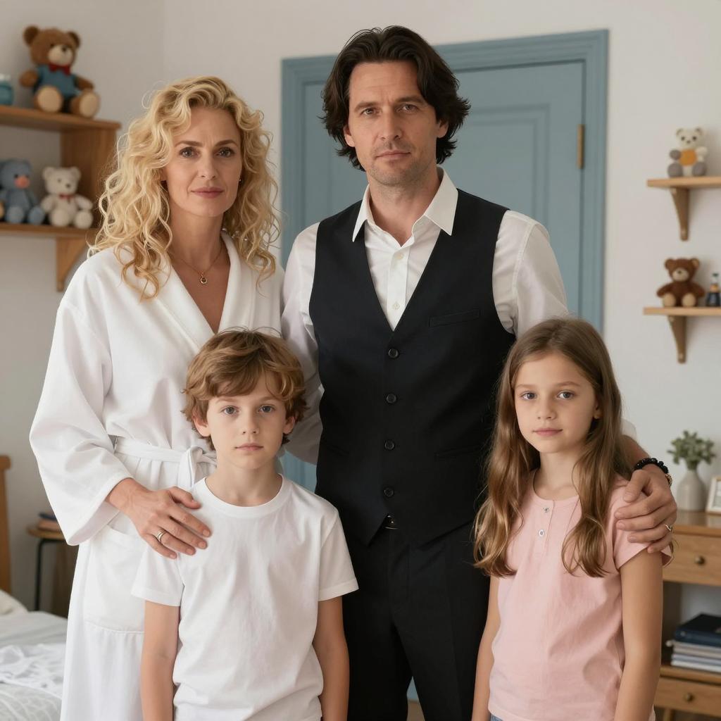 Photograph of four people. Blonde girl in red shirt with blue trim, blue sleeves, young man behind her with arm on shoulder, curly-haired woman in white shirt, older man with dark hair. Background: gray door, beige wall. All looking at camera.