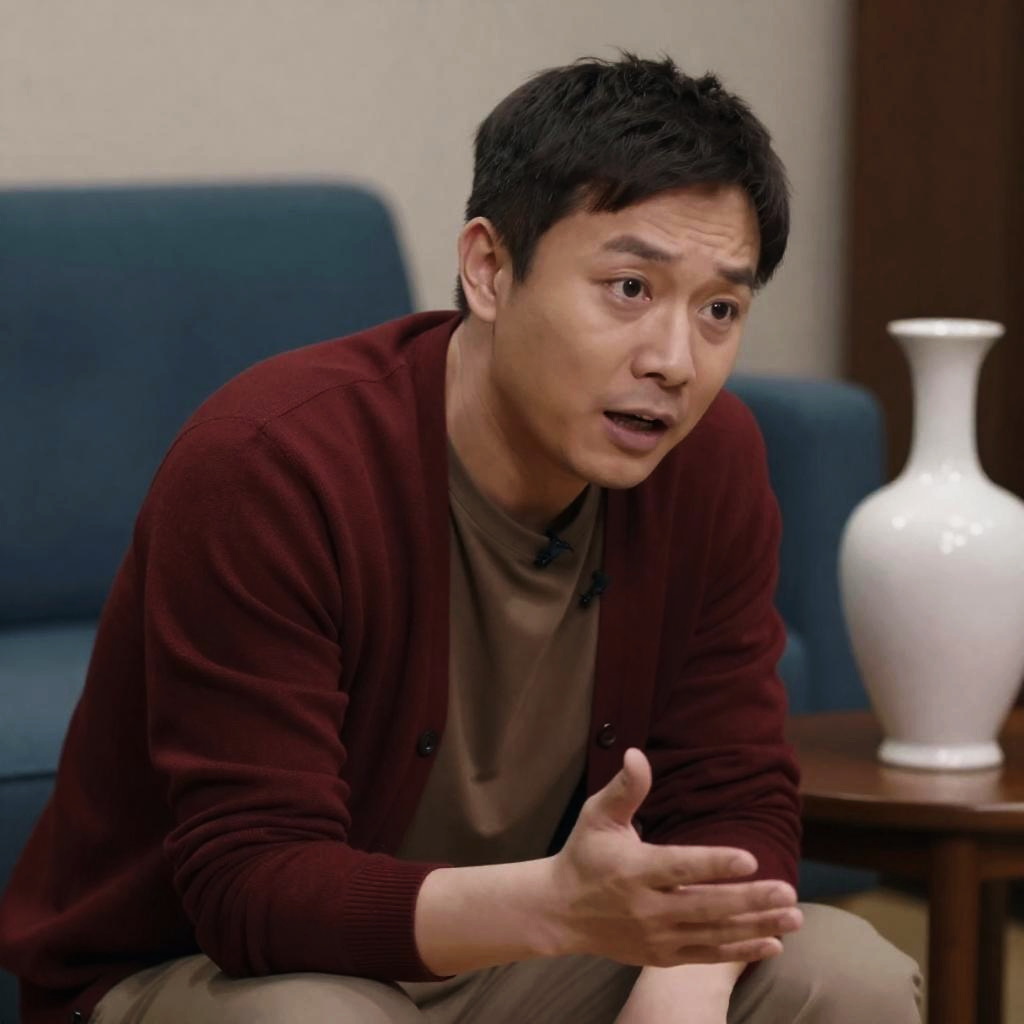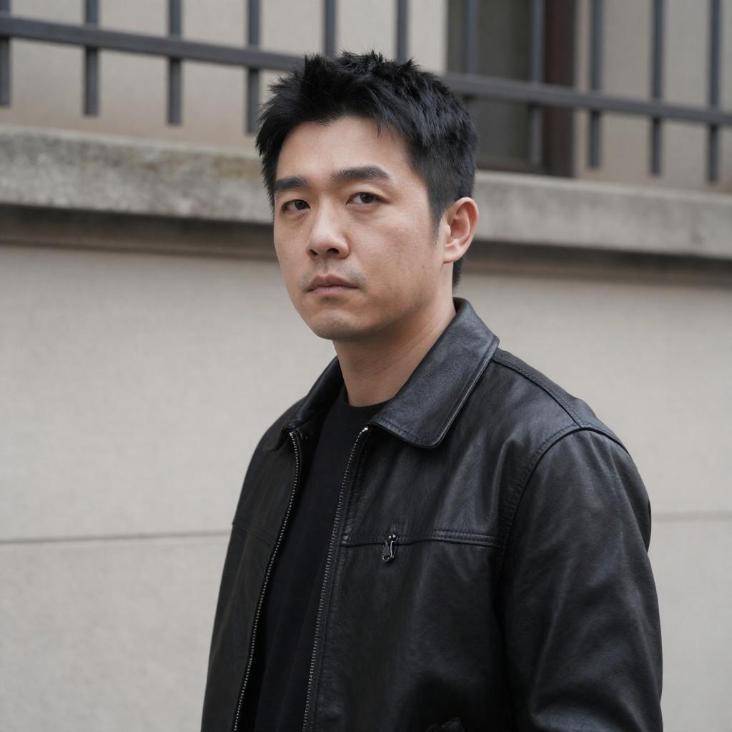 A man with short dark hair and a slight sweat on his forehead, wearing a brown leather jacket, holds a microphone and shouts passionately. Dark purple curtain background. He has a focused, intense expression.