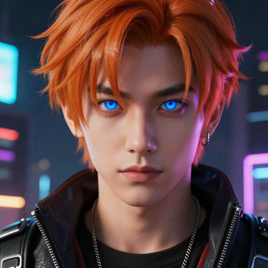 Portrait of a boy with blue hair, bright and electric shades, edgy undercut hairstyle, intense gaze, futuristic cyberpunk cityscape, neon lights, highly detailed