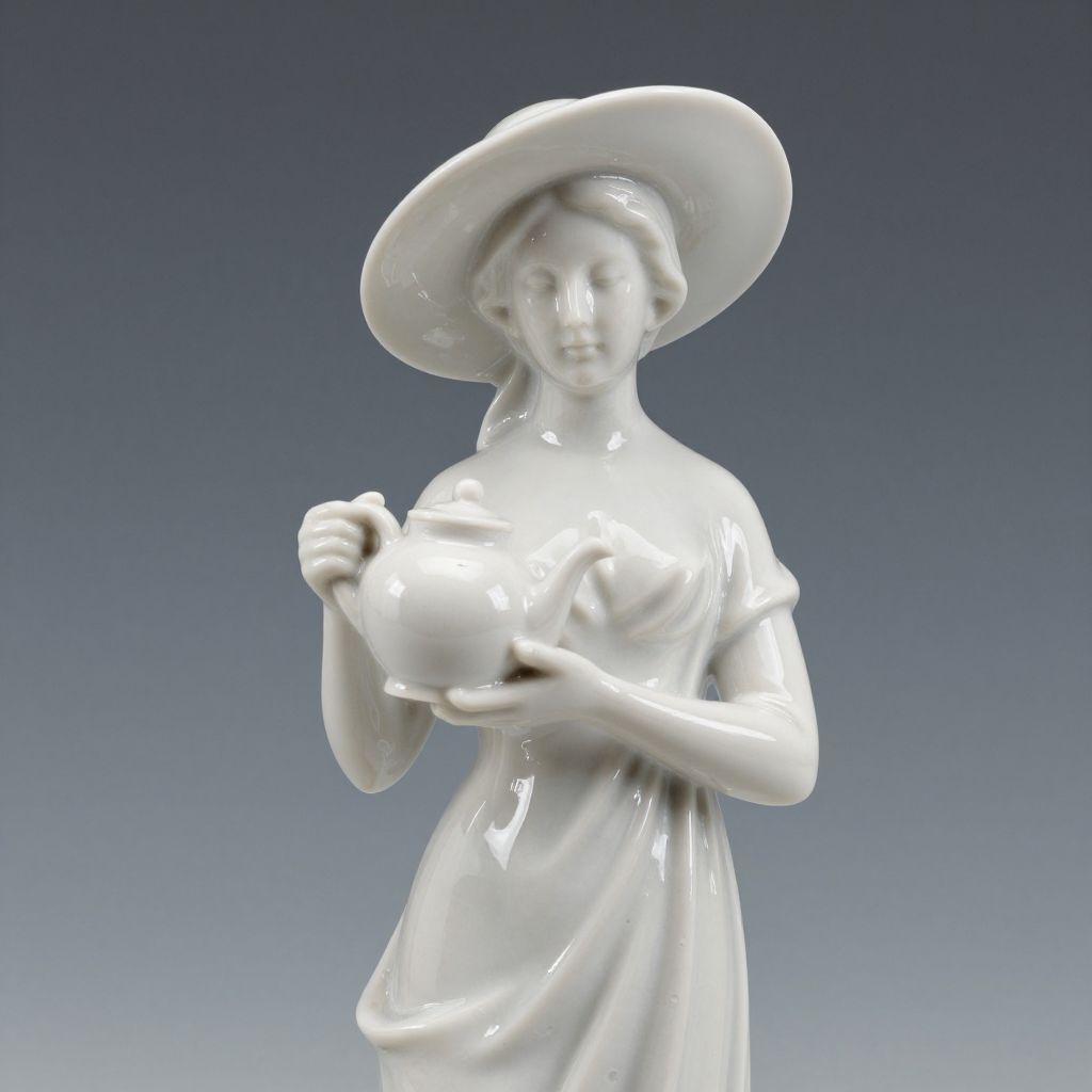 Photograph of a glossy white ceramic statue of a young woman with a wide-brimmed hat, holding a teapot against a gradient blue background.