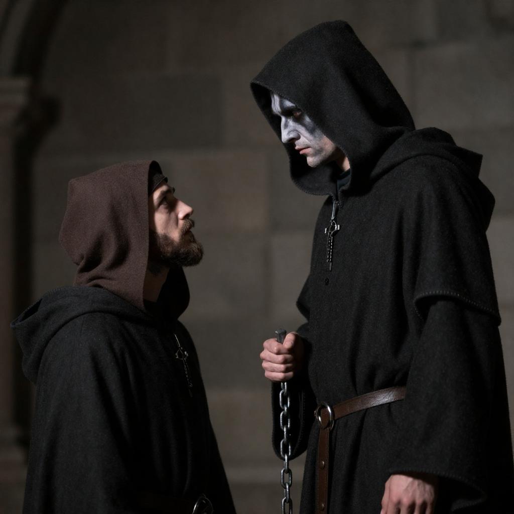 Two men in dark, medieval-style robes with hoods. The man on the left has a beard, brown head covering, and looks up at the other man. The man on the right has a grim expression, grey face paint, and holds a chain. Stone wall in background. Dim, shadowy lighting.