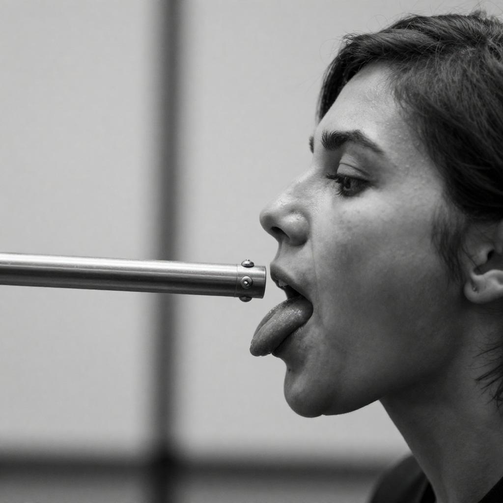 Black-and-white photograph of a woman with short dark hair, profile view, mouth open and tongue extended to touch a horizontal, ured metal rod with two bolts. Background is blurred, creating a shallow depth of field. Her expression is focused.