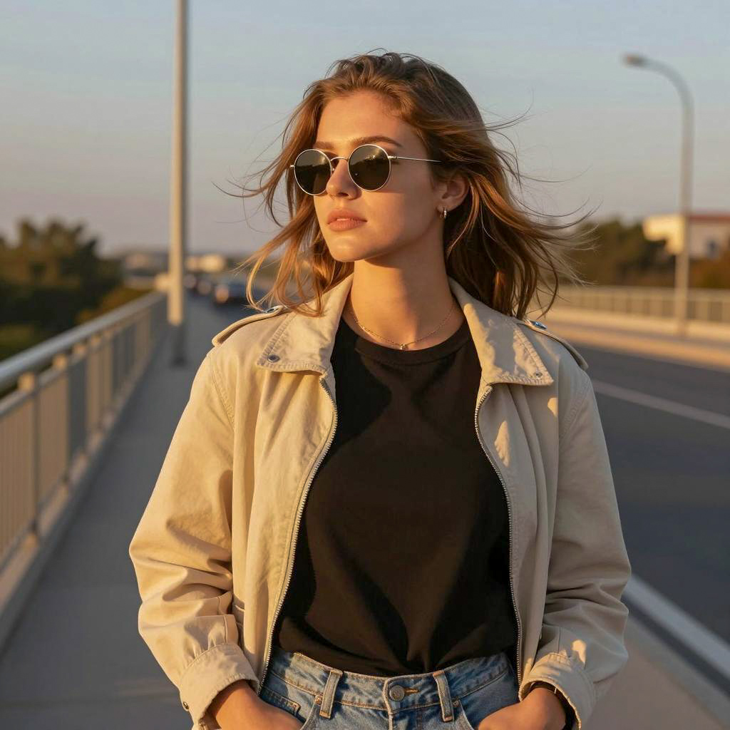 Black and white photo of a young woman with long, straight dark hair, wearing round sunglasses, a black hoodie, and a dark jacket. She is standing outdoors, slightly turned to the right, with her right hand holding the jacket's edge. Background includes a ured wall on the right and blurred urban elements on the left. She has a neutral expression, with full eyebrows and slightly parted lips.