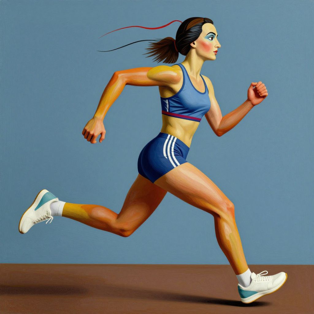 A stylized, abstract depiction of a woman in athletic attire, running, with exaggerated, elongated limbs in vibrant colors reminiscent of Salvador Dali's art.