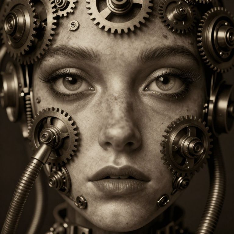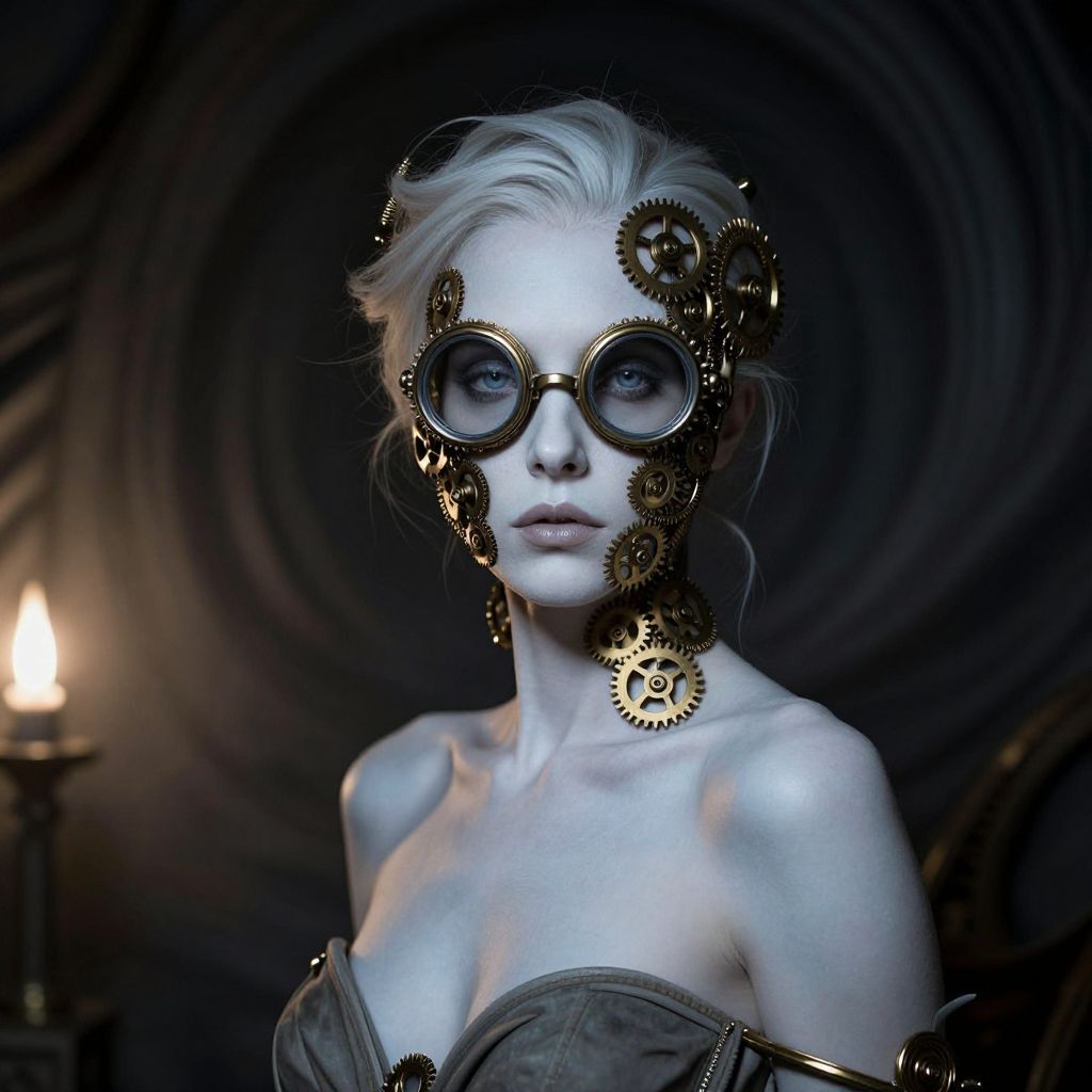 Aura Obscura, set against a backdrop of swirling shadows, an albino woman with pale, almost luminescent skin and a faint blue tint stands poised like a mythical figure, The steampunk aesthetic envelops her, with elaborate gold gears and cogs artistically integrated across her face and neck, lending an otherworldly quality, Her serious expression and large, round goggles conceal her eyes, suggesting depth and story beneath the surface, The scene is drenched in a moody atmosphere, with a pronounced light source from the left side creating a dramatic interplay of light and darkness, accentuating the gleam of metal and the softness of her skin, making the entire composition a striking blend of elegance and mystery, d0ntst0pm3n0w