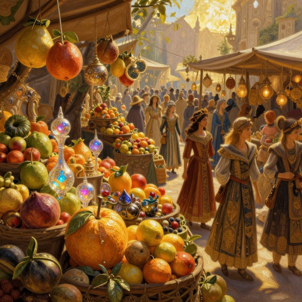 This vibrant digital painting depicts a bustling medieval market under a canopy of golden sunlight. Colorful fruits, including oranges, apples, and gourds, are displayed in wicker baskets, adorned with glowing, intricately patterned lanterns. Medieval villagers, dressed in detailed, ornate clothing with rich textures and patterns, navigate the crowded marketplace. Men and women, with varying hair colors and styles, engage in conversation and haggling. The background reveals a distant, sunlit cathedral with Gothic architecture, adding an aura of historical grandeur. The warm, golden light enhances the rich, colorful palette and intricate details, creating a lively, enchanting scene.