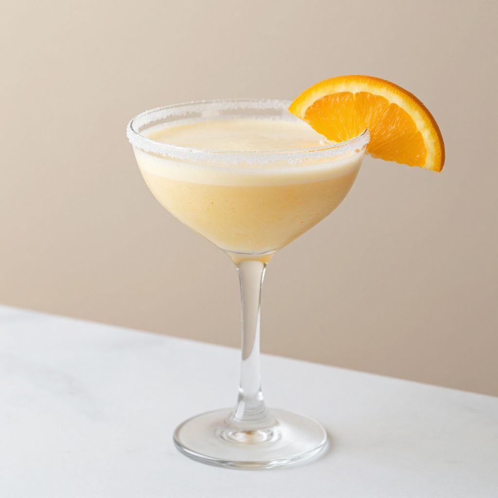 Photograph of a clear, creamy cocktail in a glass coupe with an orange slice garnish, set against a soft beige background.