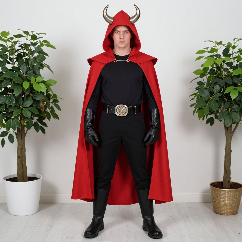 Adult villian costume, 1boy, solo, male focus, cape, gloves, horns, belt, boots, red cape, standing, hat, indoors, plant
