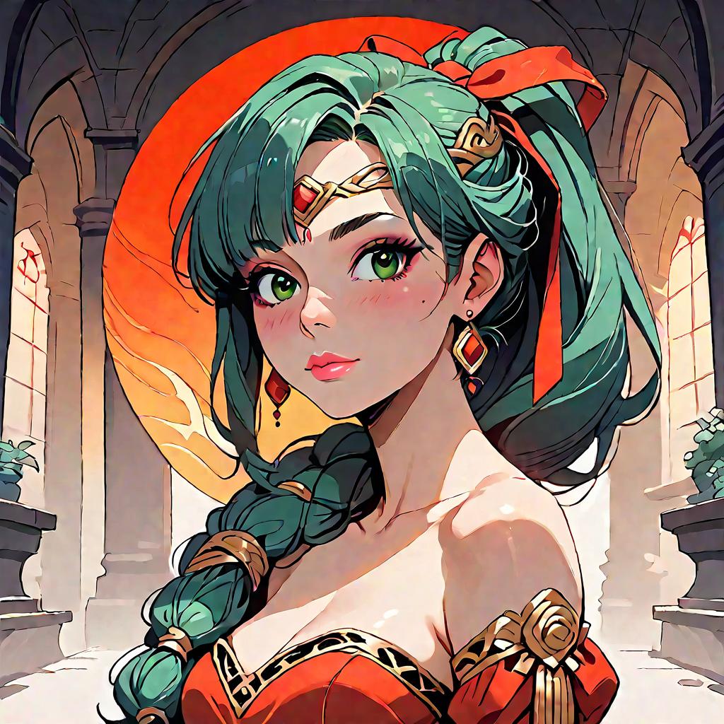 Frieden is a girl with white ponytails long hair green eyes and sharp ears, She is wearing the "mofapifeng" outfit which includes gold and white clothes and a skirt with a belt around her waist, score_9, _up score_8_up