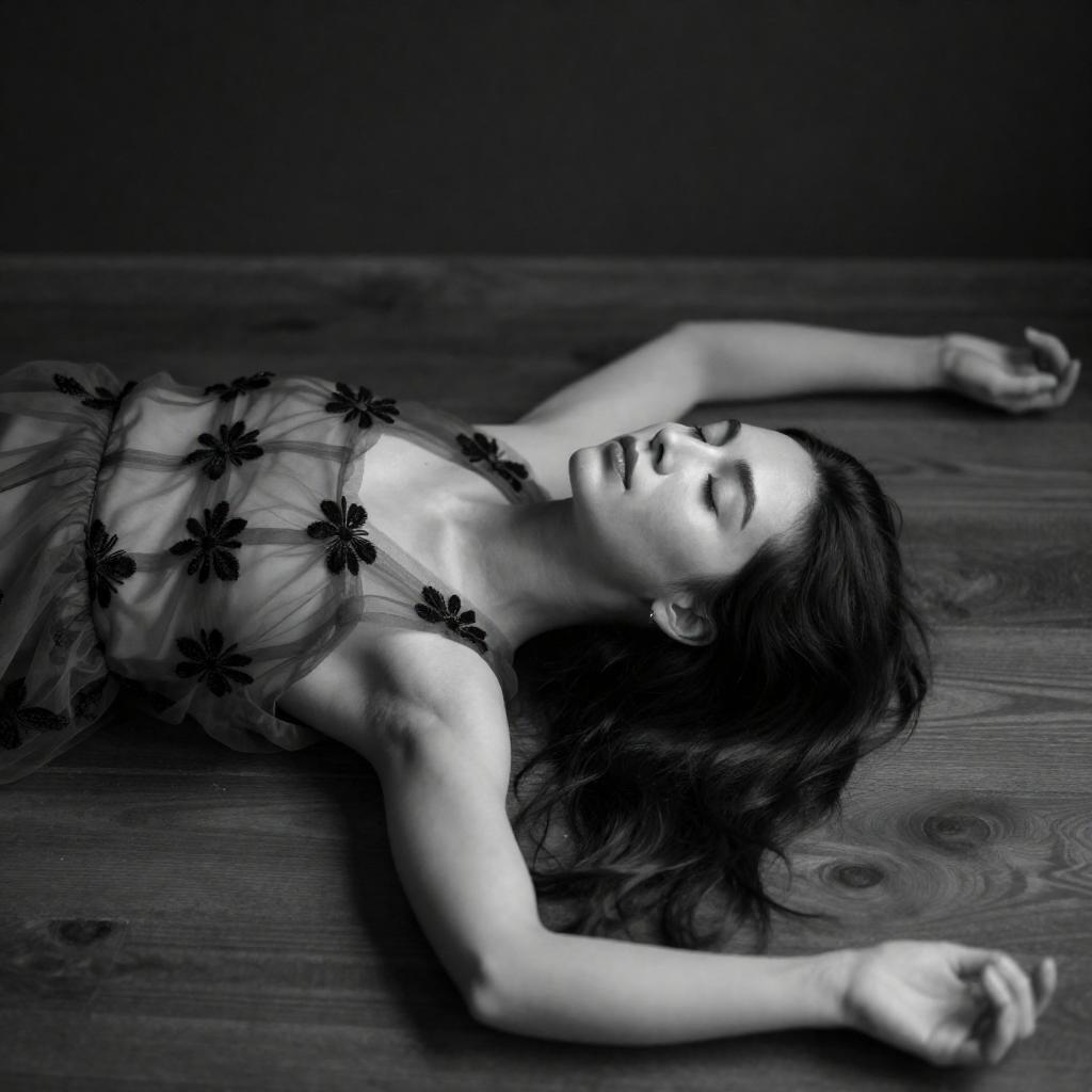 Black-and-white photograph of a woman with wavy, shoulder-length hair lying on a bed with white sheets and a lace-trimmed blanket. She is partially covered, with one arm above her head and eyes closed. The background features a wooden headboard. Her expression is serene.