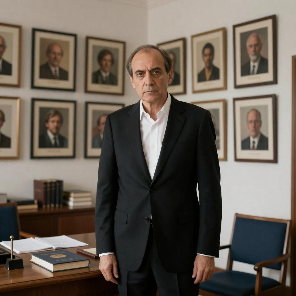 Photograph of a middle-aged man with short, dark hair, smiling, wearing a gray wool suit and striped shirt, standing next to a vintage camera on a tripod. Background includes blurred people, a woman with curly hair, and a floral arrangement. Indoor setting with wooden and upholstered furniture.