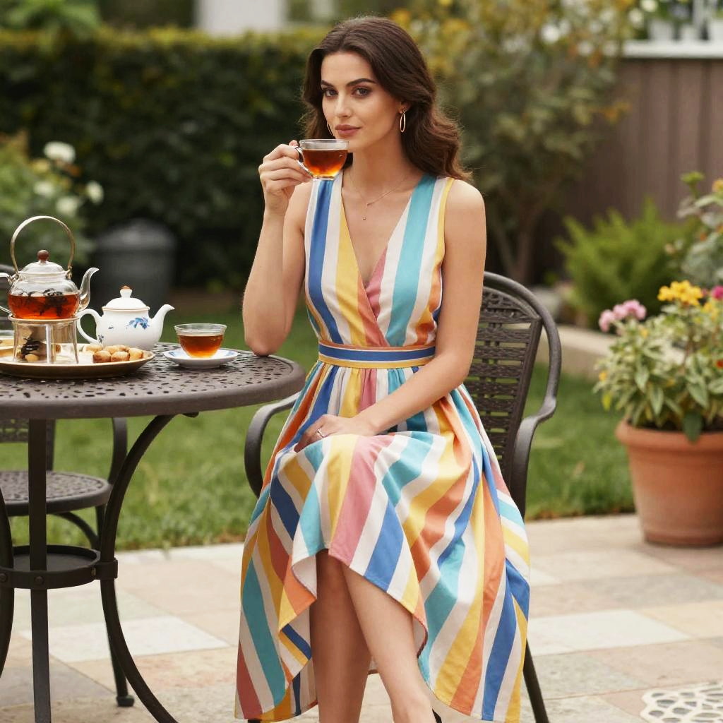 A svelte woman in a colorful A-line midi dress with stripes, deep v-neckline, and high-low hem, enjoying tea service on a garden patio, in a vibrant visual style reminiscent of studio bones. Sexy. Pretty face and beutiful eyes