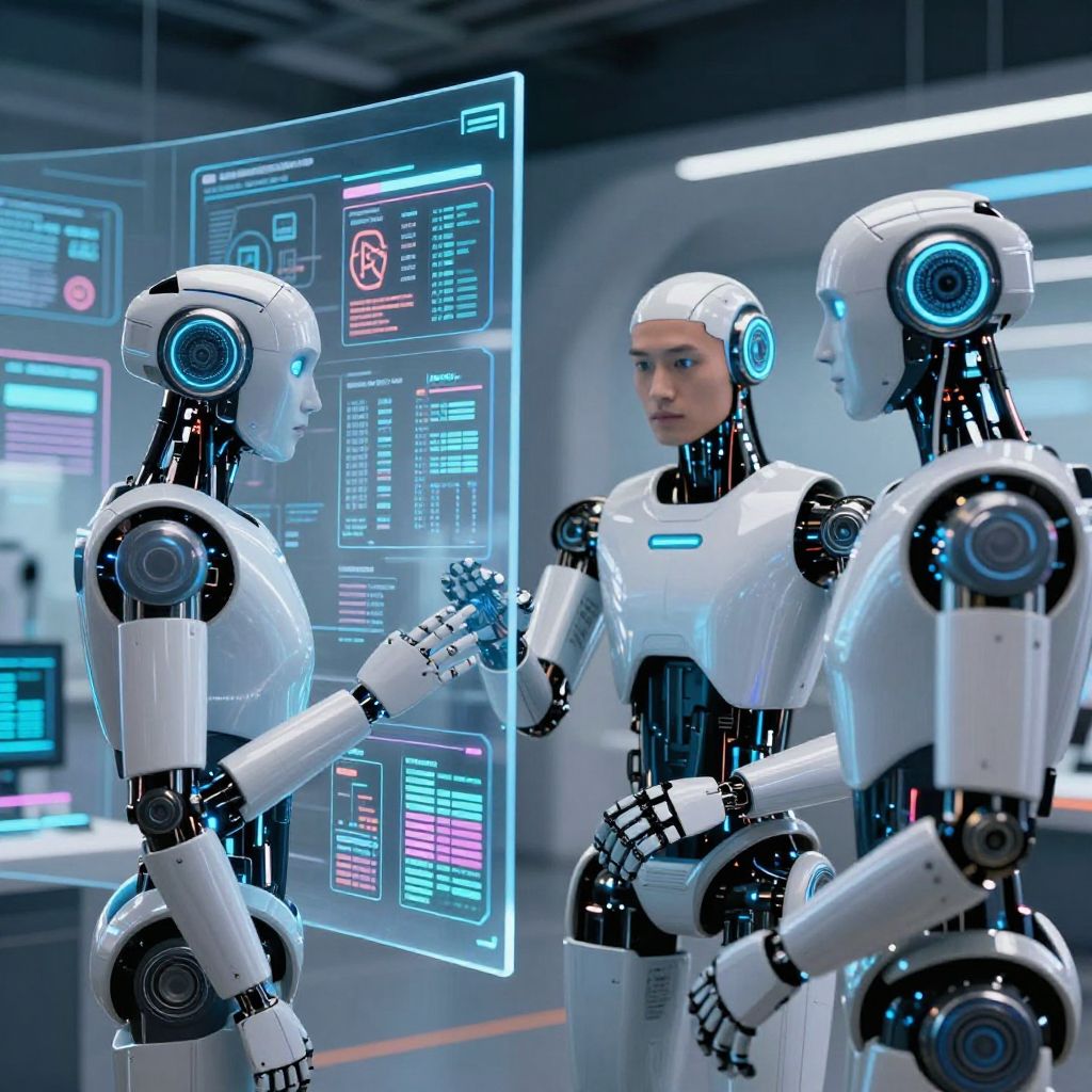 Open AI pictures illustrating intelligent robots collaborating with humans in a high-tech environment, transparent screens with complex data analytics, seamless integration of AI into daily life, sharp details, sci-fi ambiance with neon highlights