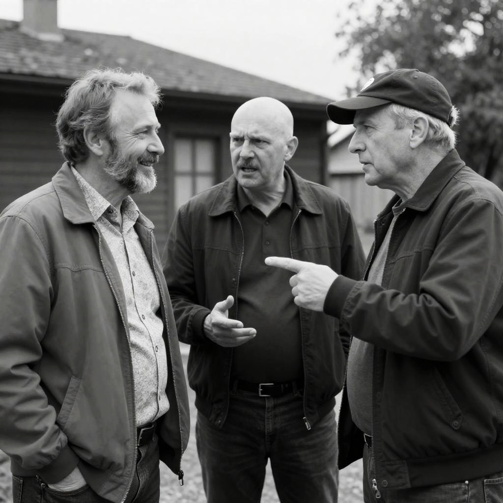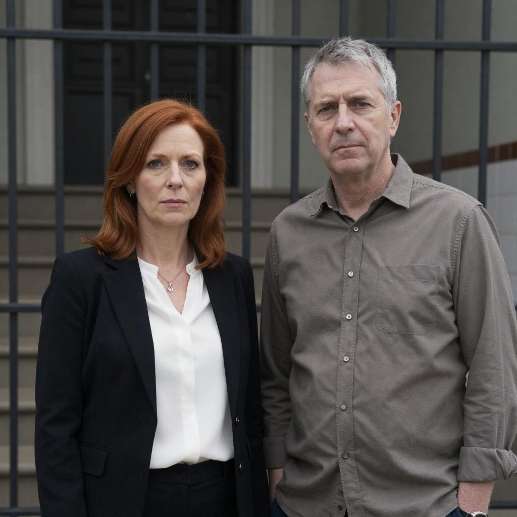 Photograph of two men standing side by side in front of a red and yellow banner. Both men have serious expressions. Left man has long blonde hair, beard, gray coat, dark shirt. Right man has short brown hair, blue-gray shirt, cuffed sleeves. Two older men are kneeling behind them. Gray stone wall in background.