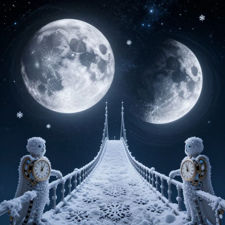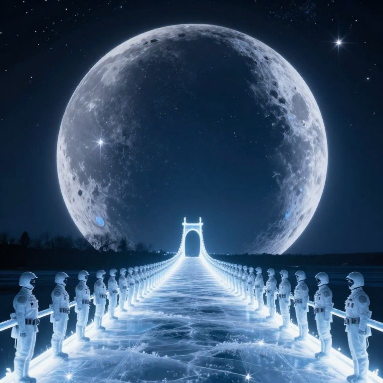 A luminous bridge of starlight arches between two radiant moons, its icy surface patrolled by uniformed figures who seem to dissolve into the celestial glow.