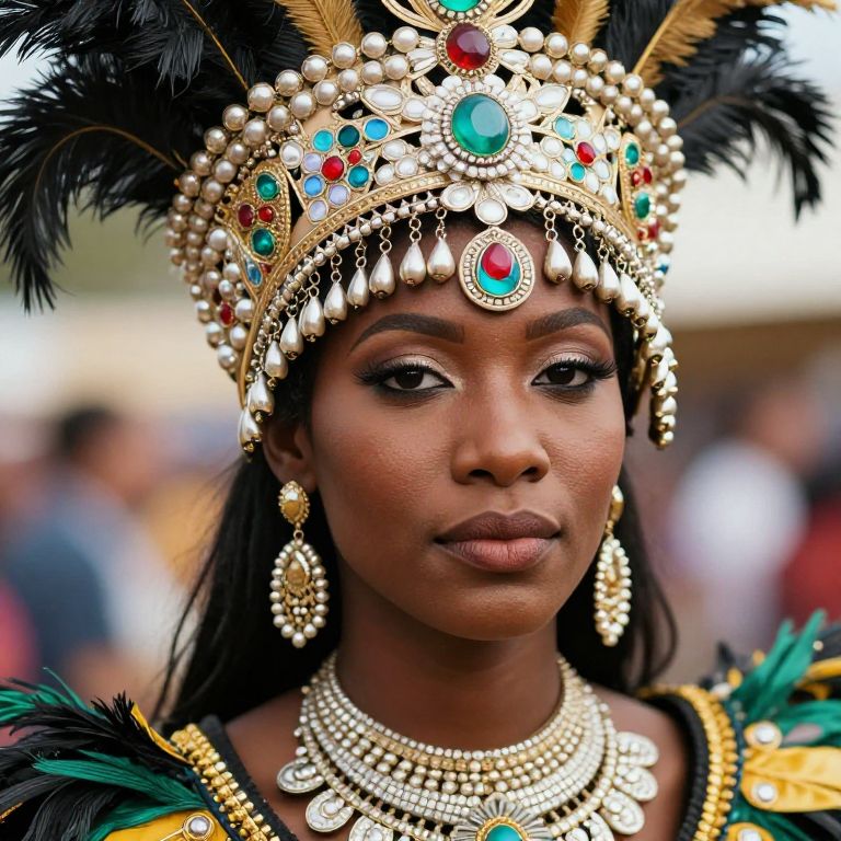 Photograph of a Black woman with dark skin and smooth complexion, wearing an elaborate, ornate headdress adorned with black feathers, gold, red, and turquoise gemstones. She has long, black hair, and her makeup includes subtle eyeshadow and dark eyeliner. She wears a multi-layered pearl necklace and matching earrings, with a golden garment featuring green accents visible on her shoulders. The background is blurred, suggesting an outdoor setting with people and structures. The headdress and jewelry are intricate, with detailed patterns and textures, emphasizing cultural or ceremonial attire. The image is vibrant and rich in color.