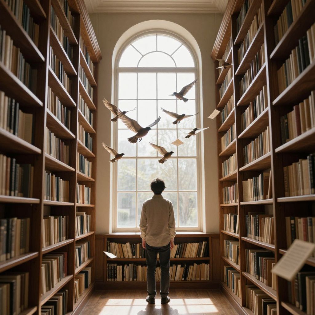 Photograph of a tall, narrow library with tall, wooden bookshelves on both sides, filled with books. A solitary figure with short, dark hair, wearing a white shirt and blue jeans, stands in the center, facing a large, arched window at the far end. Through the window, six birds fly in mid-air, casting shadows. The sunlight streaming in illuminates the room, creating a warm, inviting atmosphere. The floor is wooden, and a few books are scattered on the shelves and floor. The image evokes a sense of solitude and contemplation.