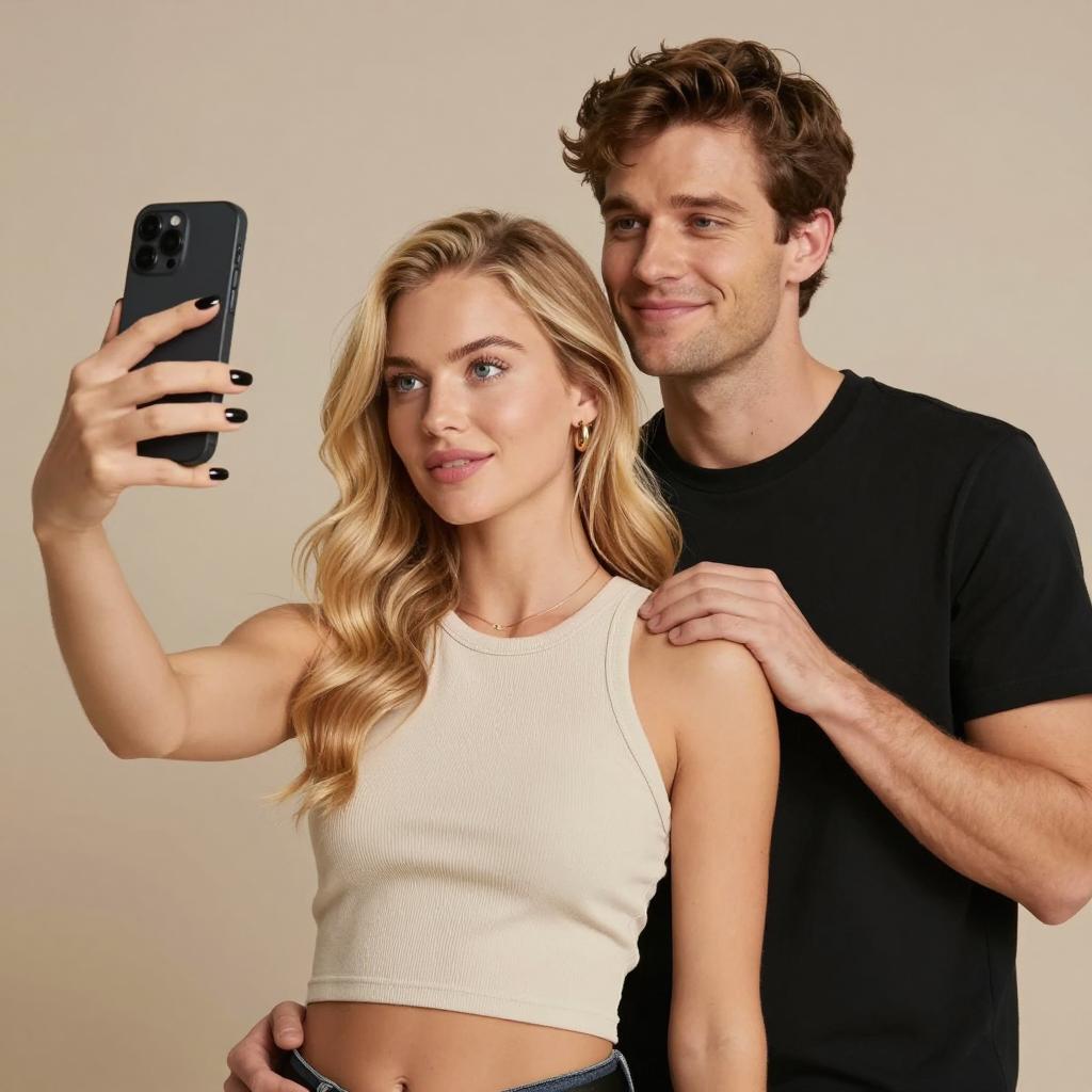 Photograph of a young woman with long, wavy, blonde hair, light skin, and blue eyes. She wears a dark maroon leather jacket, looking directly at the camera with a neutral expression. She holds an iPhone in her right hand, positioned on the right side of the image. White background.