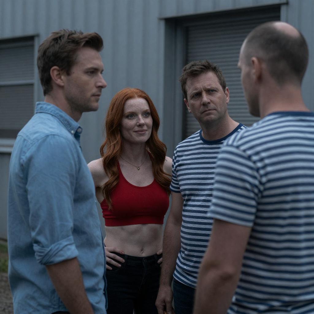 Photograph of three people in a clothing store. A muscular man with short blonde hair, wearing a white t-shirt with a cartoon graphic, stands between a red-haired woman in a green dress and a bald man with a ponytail, in a blue patterned shirt. The woman smiles, the bald man looks up at the muscular man. Background includes clothing racks and hats.