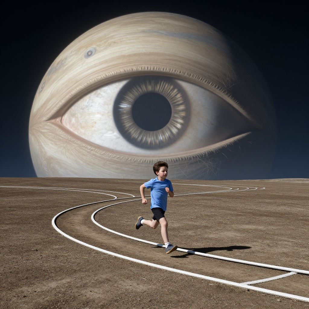 Photograph-like digital art of a young boy in blue shorts and shirt running on a track, with a giant, surreal eye in the background under a