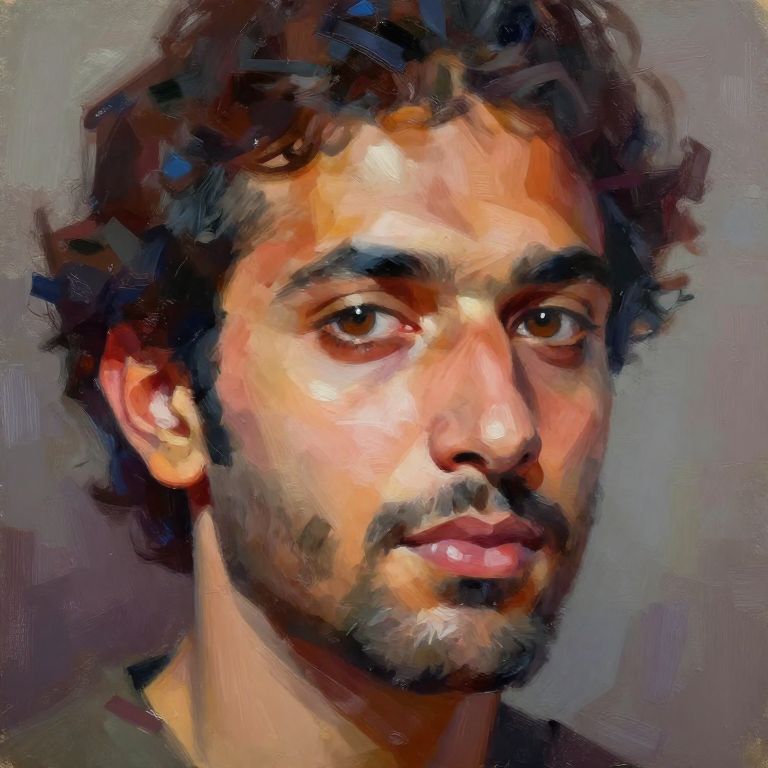 Shawkat portrait in vibrant colors, detailed facial features, expressive eyes, ambient soft lighting, digital painting style, modern artistic interpretation, textured brush strokes blending realism and impressionism.