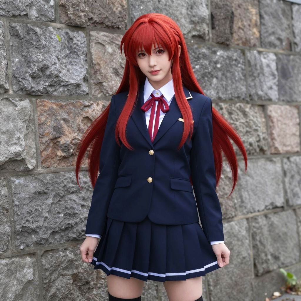 A woman cosplaying as Shana from the anime series 'Shakugan no Shana' poses against a stone wall in a classic Japanese school uniform. The image highlights her long red hair and the detailed outfit including a navy blazer, pleated skirt, and red necktie, capturing the anime style with a realistic photography approach.