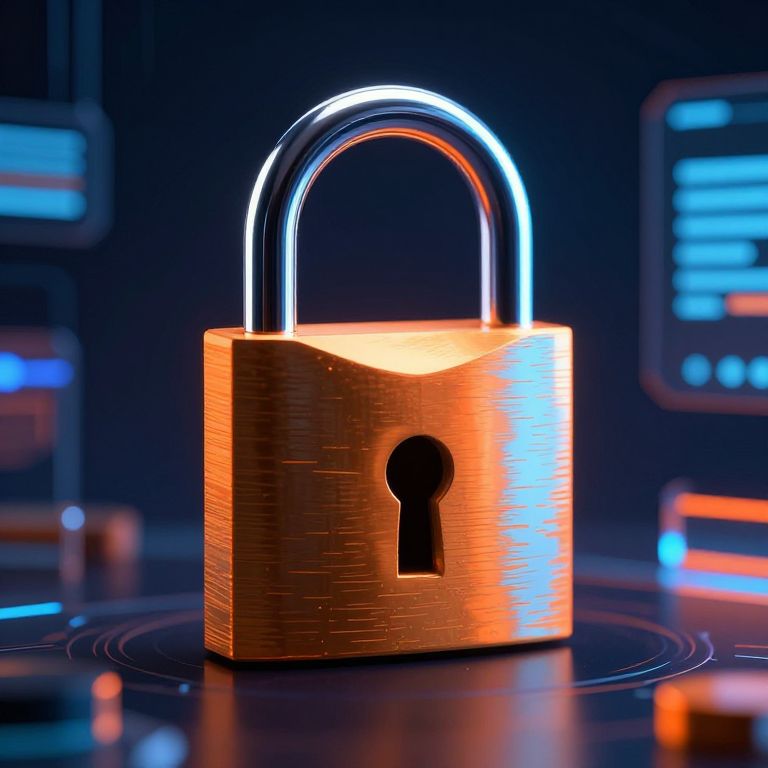 Functional Art a padlock amidst a background of technology, blockchain, flashing neon lights, color accents of orange and dark blue,