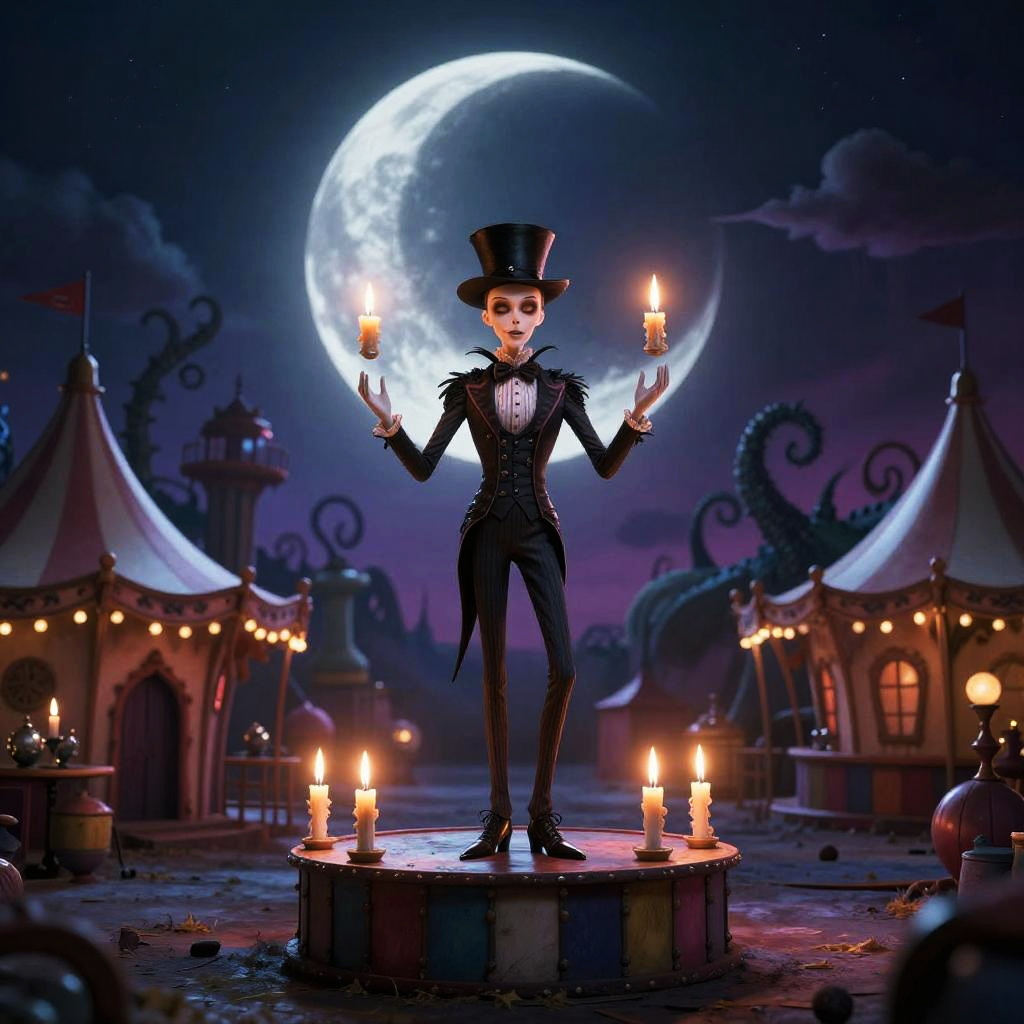 A neon production still of Tim Burton's surreal carnival, a slender ringmaster juggling flickering candle orbs, twisted carnival grounds under a large crescent moon, hyperrealistic, 500mm, vintage aesthetic.