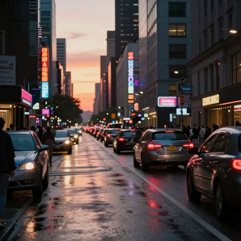 Photograph of a busy urban street at sunset, with cars lined up, neon signs illuminating the wet pavement, and tall buildings flanking both sides