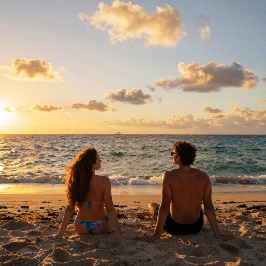 Two friends Miami beach sunset golden hour relaxed on sandy shore turquoise waves gentle breeze vibrant sky