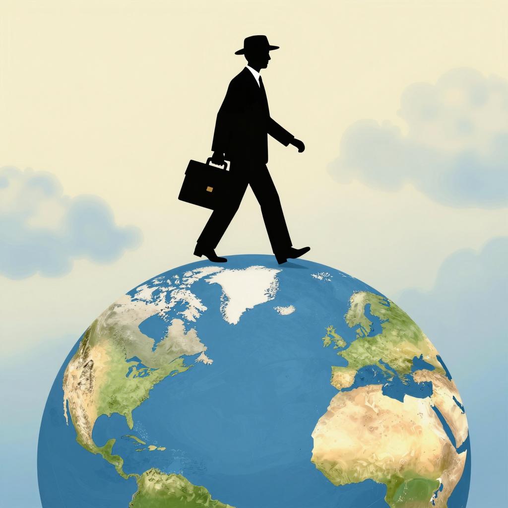 Four silhouetted men with hats walking in a row on a ured, shadowy surface. Each man casts long, distinct shadows. Background features angular, geometric patterns in muted brown and gray tones. Men are in varied poses: one with arm raised, others with arms down. Shadows of hats and bodies are sharply defined.