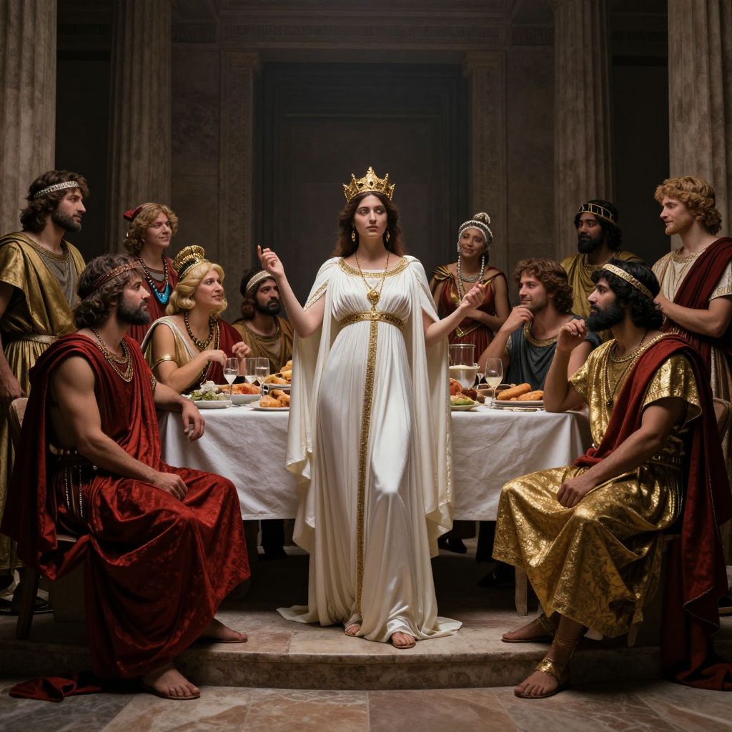 Photograph of a classical scene depicting a regal woman in a white, draped, ancient Greek-style gown with a gold crown, standing in the center. She holds a small object aloft in both hands. Surrounding her are ten men, dressed in richly colored, gold and red togas with gold crowns, seated at a table laden with food and wine. The background features tall, dark stone pillars, creating a grand, temple-like atmosphere. The lighting focuses on the central figure, casting shadows on the men and the background. The image has a dramatic, almost cinematic quality.
