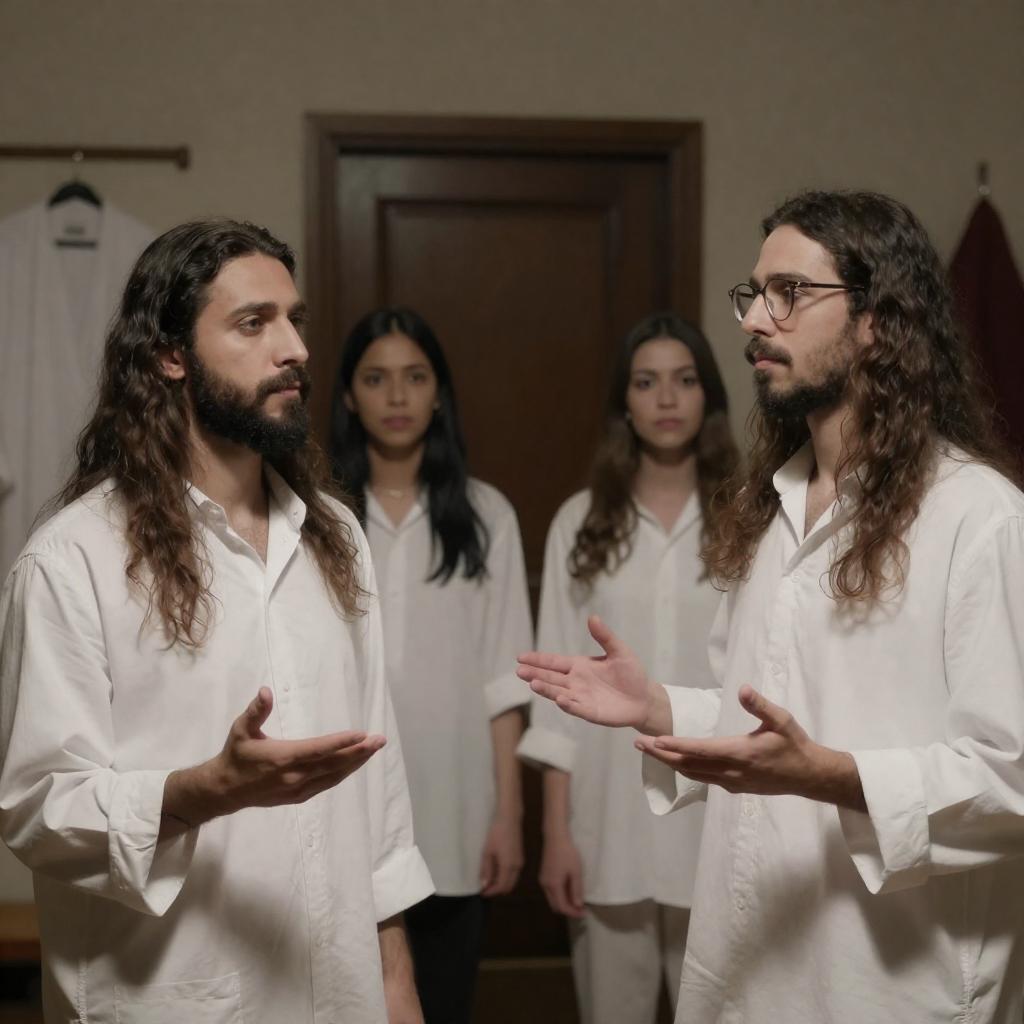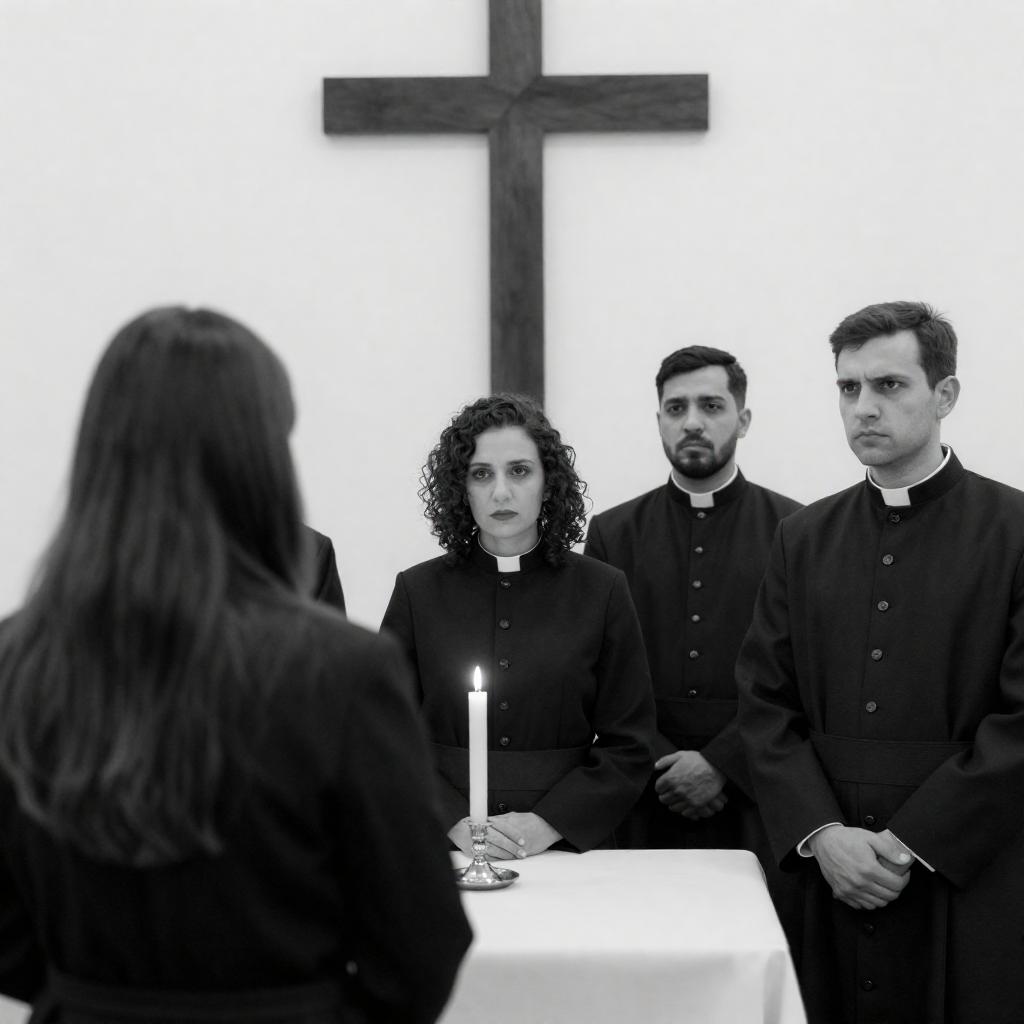 Photograph of a dimly lit room with a group of monks in black habits, their backs to the camera. A young woman with fair skin and dark hair stands among them, her intense gaze directed forward. Framed religious artwork on the wall behind her. Three men with gray hair and beards visible. Monks' expressions neutral, woman's expression intense. Arched doorway in background.