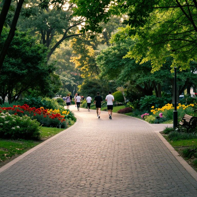Peatonal pathway winding through a serene park, framed by lush green trees and colorful flowers, gentle sunlight filtering through leaves, peaceful mood, soft focus background, detailed cobblestone textures, families and joggers enjoying a calm urban oasis.