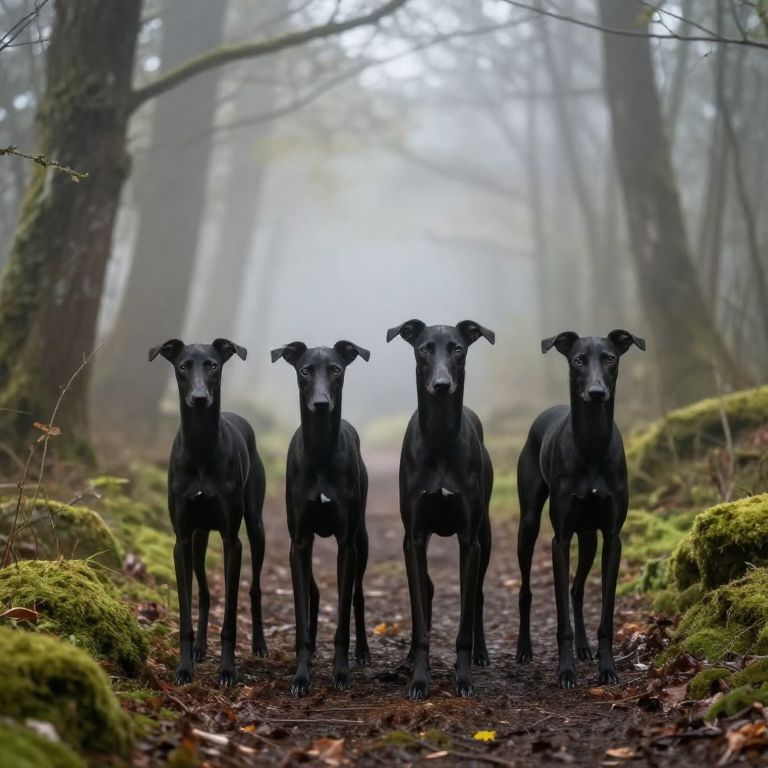 Photograph of four black Greyhound dogs standing in a foggy forest. The dogs, with sleek, muscular builds and short coats, are positioned in a line facing the camera. The forest floor is covered in brown leaves and moss, with tall, misty trees in the background. Soft light filters through the fog, creating a mystical atmosphere. The dogs' ears are perked up, and their eyes are alert, adding a sense of curiosity and alertness to the scene. The image is sharp with a shallow depth of field, blurring the background.