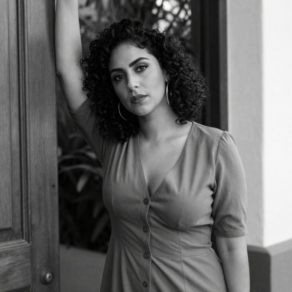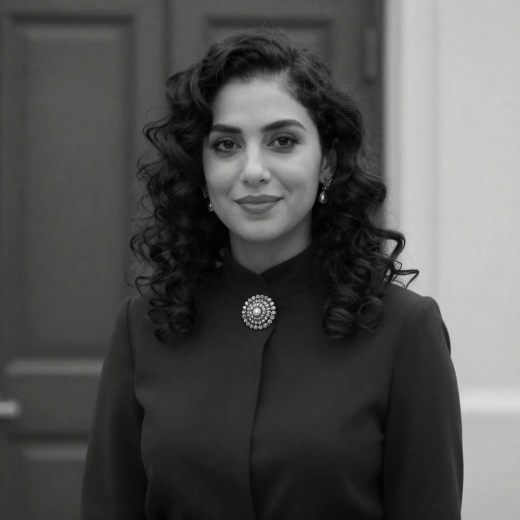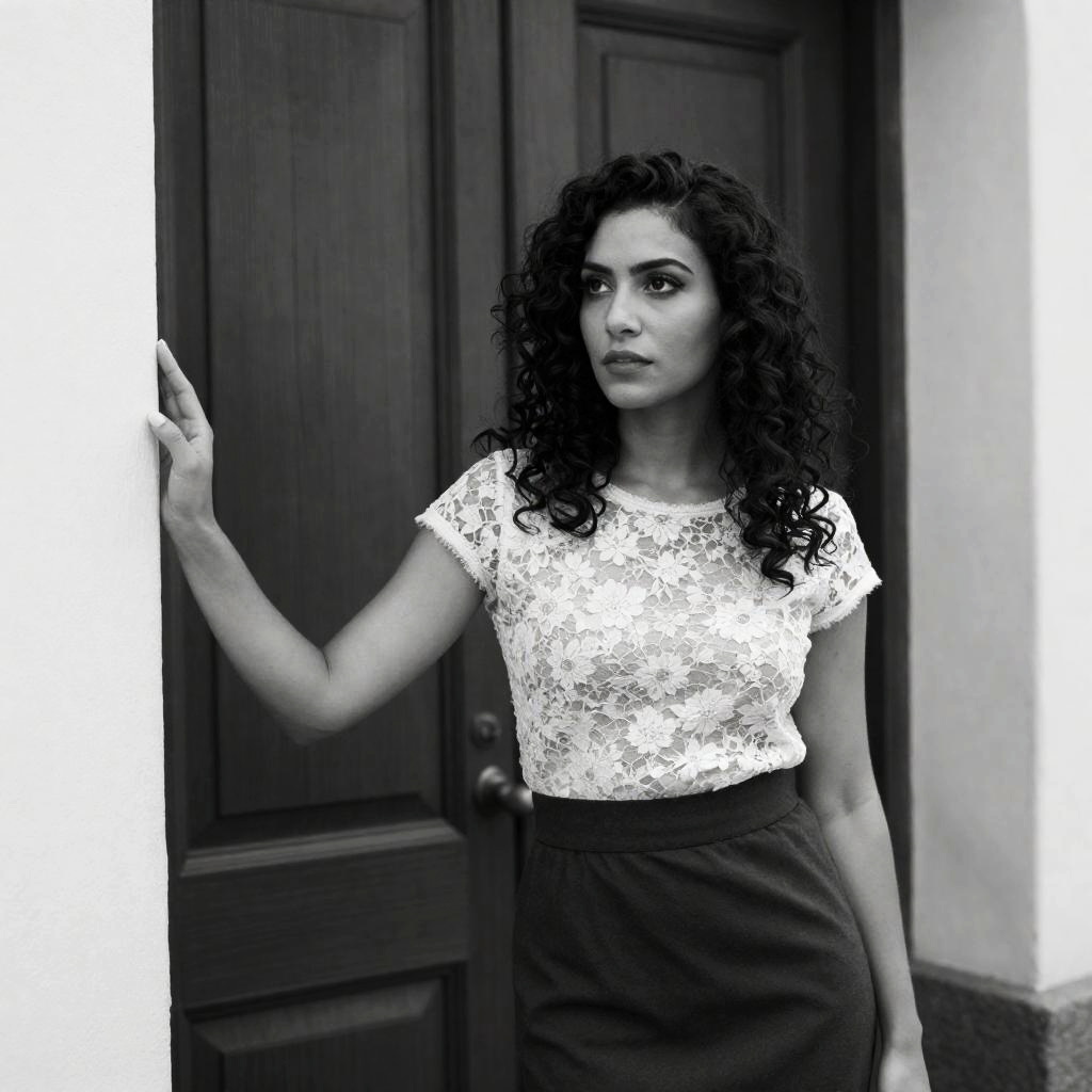 Black-and-white photograph of a woman with curly, wavy hair, wearing a dark, high-collared blouse with a decorative brooch. She has elegant earrings and a slight smile. Background includes blurred door and wall. She is centered, looking directly at the camera.