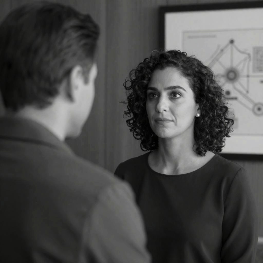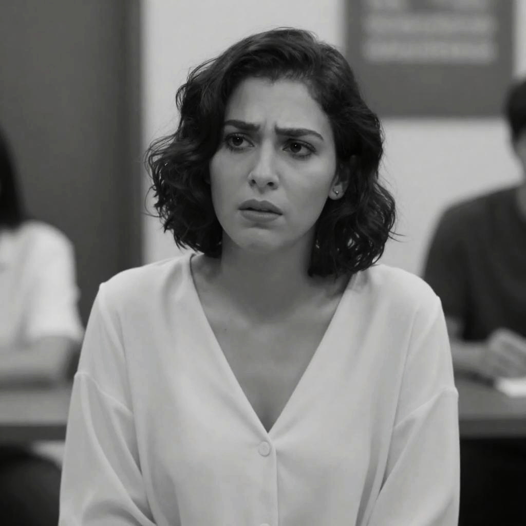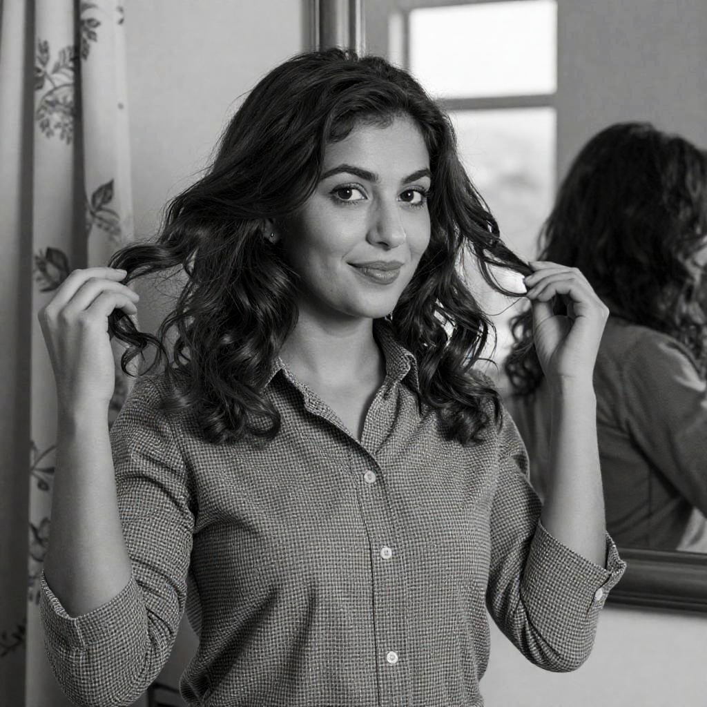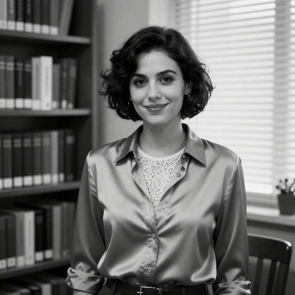 Black-and-white photograph of a woman with curly, wavy hair, wearing a dark, high-collared blouse with a decorative brooch. She has elegant earrings and a slight smile. Background includes blurred door and wall. She is centered, looking directly at the camera.