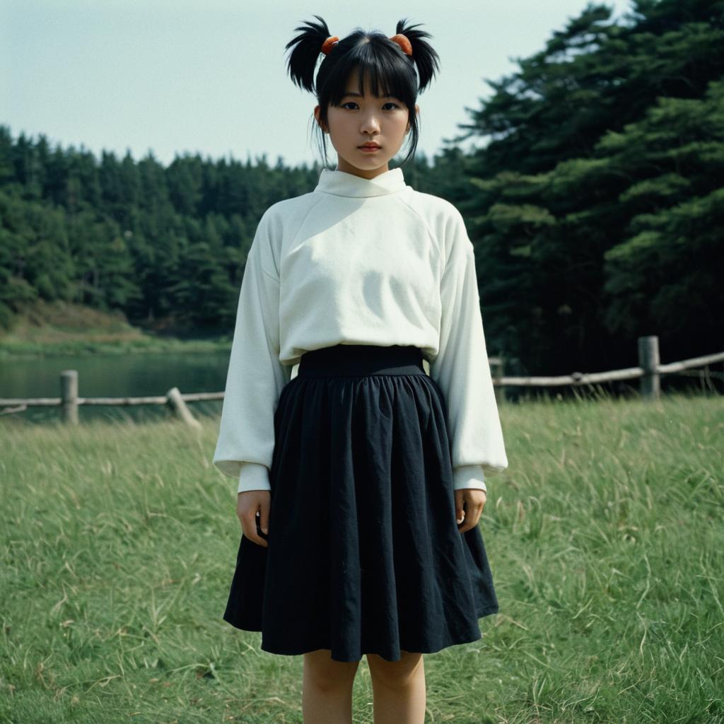 Young Asian girl dressed in a Spirited Away inspired costume featuring a white long-sleeve top and a black skirt. She has black hair styled into two ponytails with orange hair ties and is standing outdoors in a grassy area near a lake with trees in the background, looking directly at the viewer with a neutral expression.
