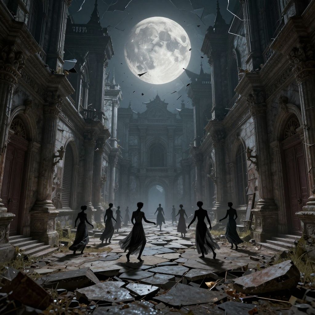 Digital artwork depicts a gothic, ruined cathedral under a large, bright full moon. Silhouetted figures in long, flowing robes dance on a cracked, rubble-strewn stone floor. Tall, ornate arches and crumbling columns frame the scene. Dark, misty fog swirls around the figures, enhancing the eerie atmosphere. Broken debris and overgrown grass add to the decay. Birds fly near the moon, adding movement. The dark, moody color palette contrasts with the bright moonlight, creating a dramatic, supernatural ambiance. The style is reminiscent of dark fantasy or horror art.