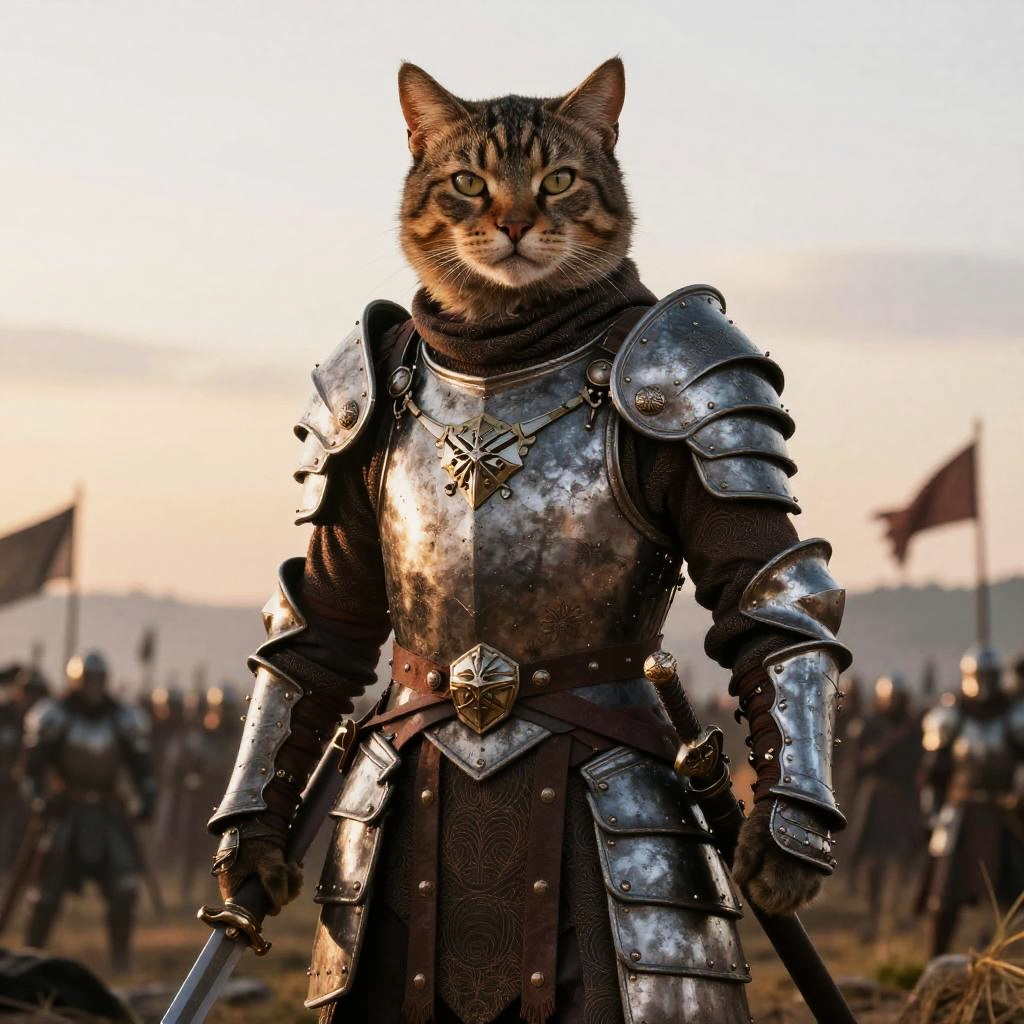 Cat soldier art, a fierce feline warrior in detailed medieval armor, standing heroically on a battlefield at dawn, intricate fur texture, dramatic lighting, fantasy style