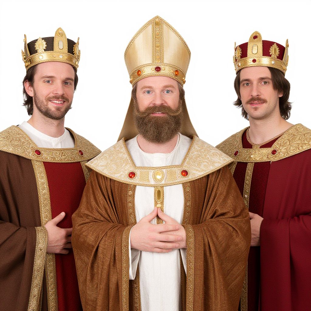 Three kings costume adult, crown, facial hair, multiple boys, robe, beard, mitre, male focus, mustache