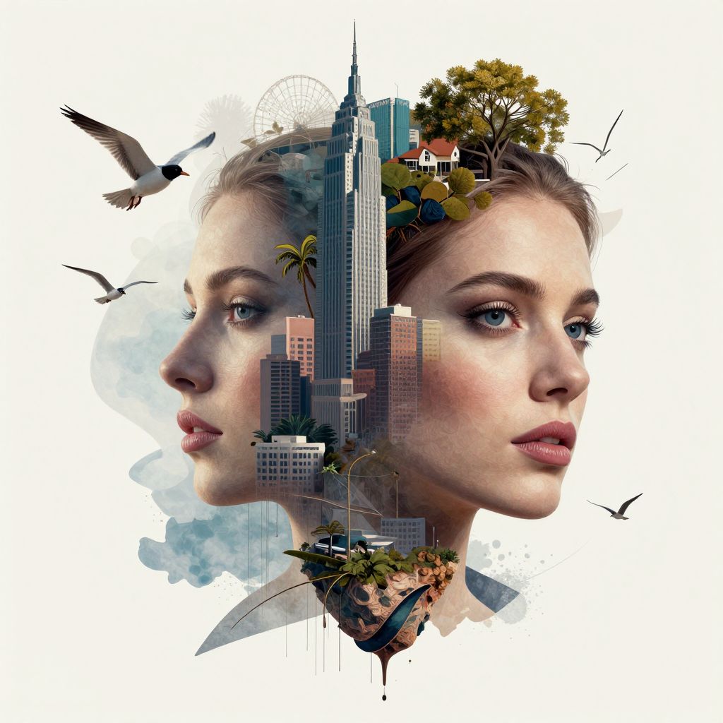 Digital artwork: Profile of a young woman with wavy brown hair, floating above a floating cityscape with skyscrapers, trees, and birds against