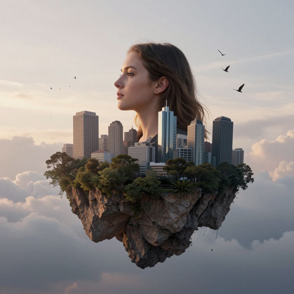 Cityscape emerges from a woman's head, suspended above her as a floating island of skyscrapers and trees, bathed in the soft glow of twilight and dotted with birds soaring against a cloudy sky.