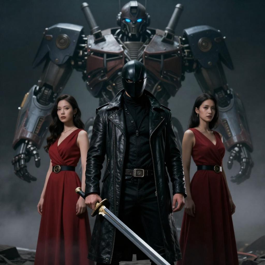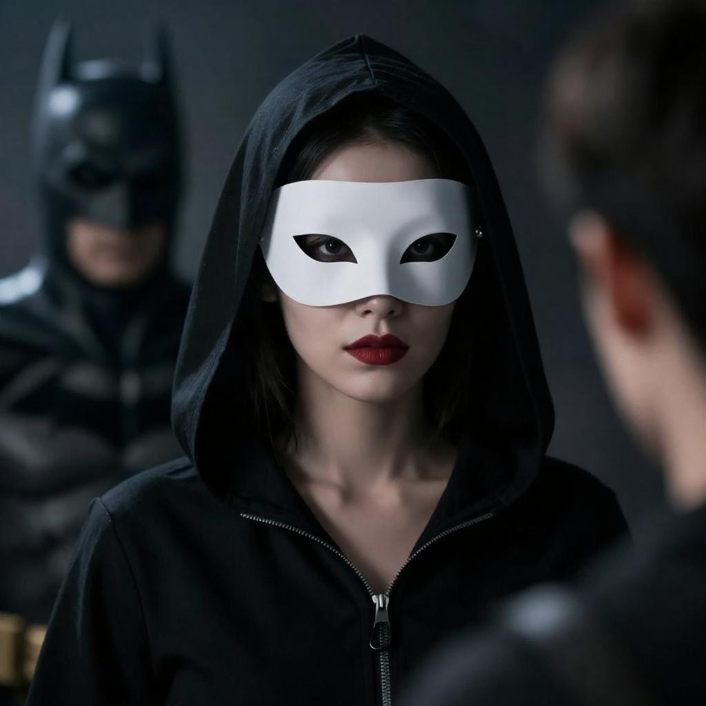 Mysterious woman with pale skin, black hood, and white mask with black eye markings and red lips. Dark, dimly lit background with blurred silhouette of Batman on the left. Partially visible person with dark hair on the right.