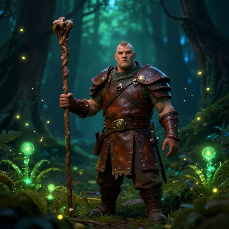Stocky appearance character in a fantasy forest setting, dressed in rustic leather armor, holding a wooden staff, surrounded by glowing magical plants and floating fireflies, atmospheric lighting with rich green and blue hues, highly detailed and immersive.